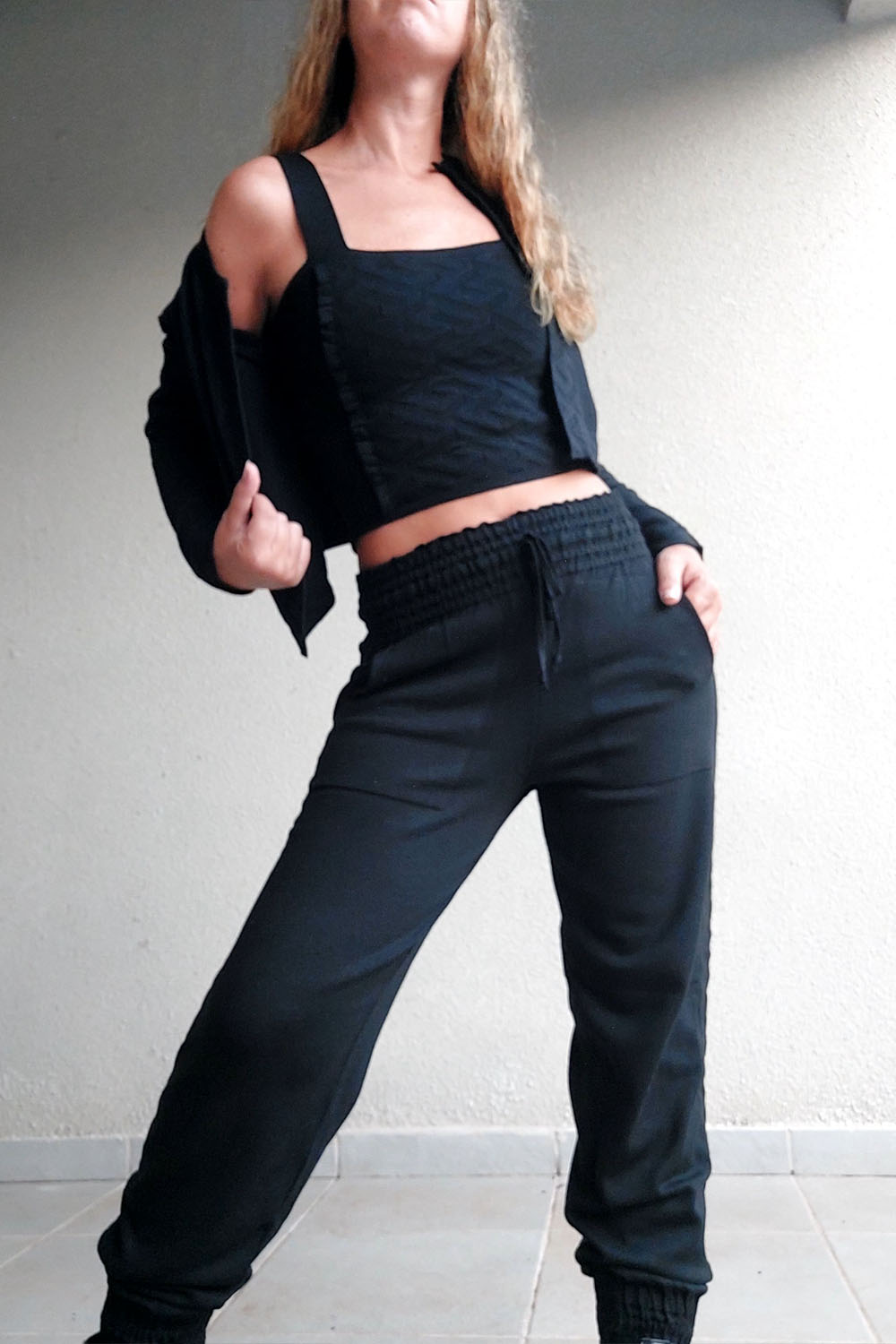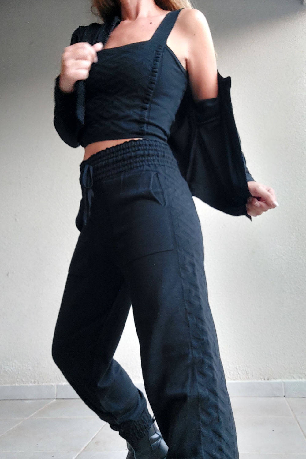 Pantalón Babucha: Funcionalidad y vanguardia se unen en esta pieza que cuenta con bolsillos y un estratégico cambio de trama lateral, diseñado para estilizar las piernas.