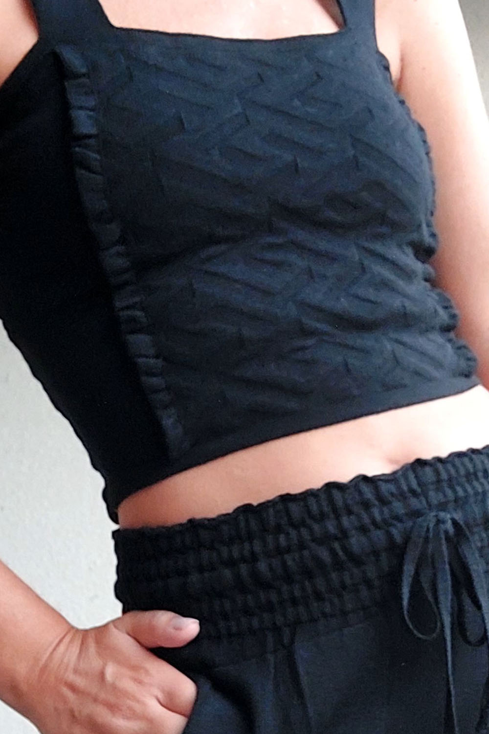 Musculosa Detalle: Presenta un exquisito trabajo de trama en el frente y delicados voladitos. Cuenta con un sistema de espalda elástica que asegura un ajuste perfecto y cómodo a tu silueta.