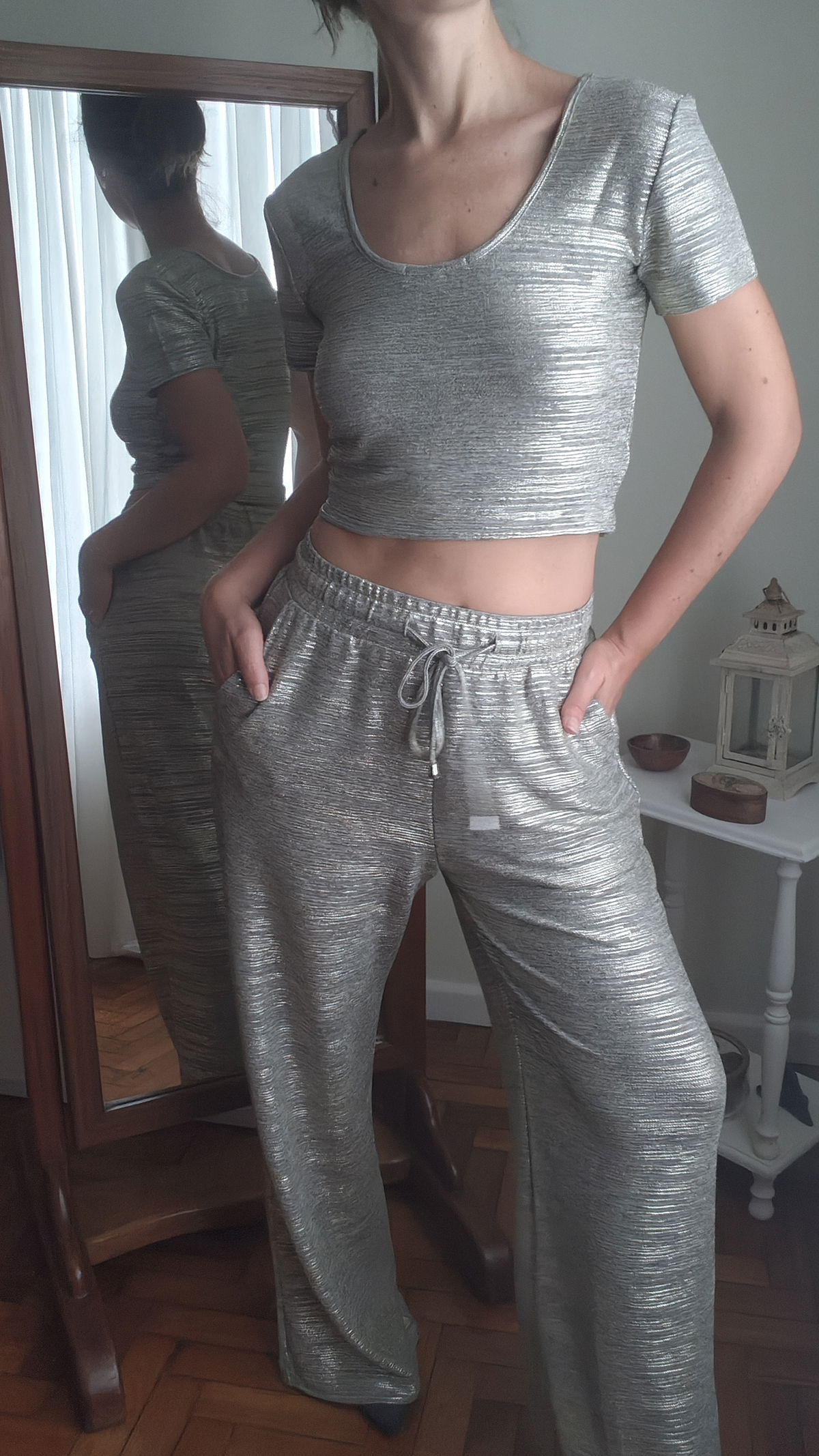 El Conjunto Dior es nuestra propuesta más audaz de la temporada. Un set de dos piezas que combina la frescura de una remera de corte contemporáneo con la fluidez de un pantalón de caída impecable, todo bajo un acabado metalizado que garantiza una presencia imponente.
