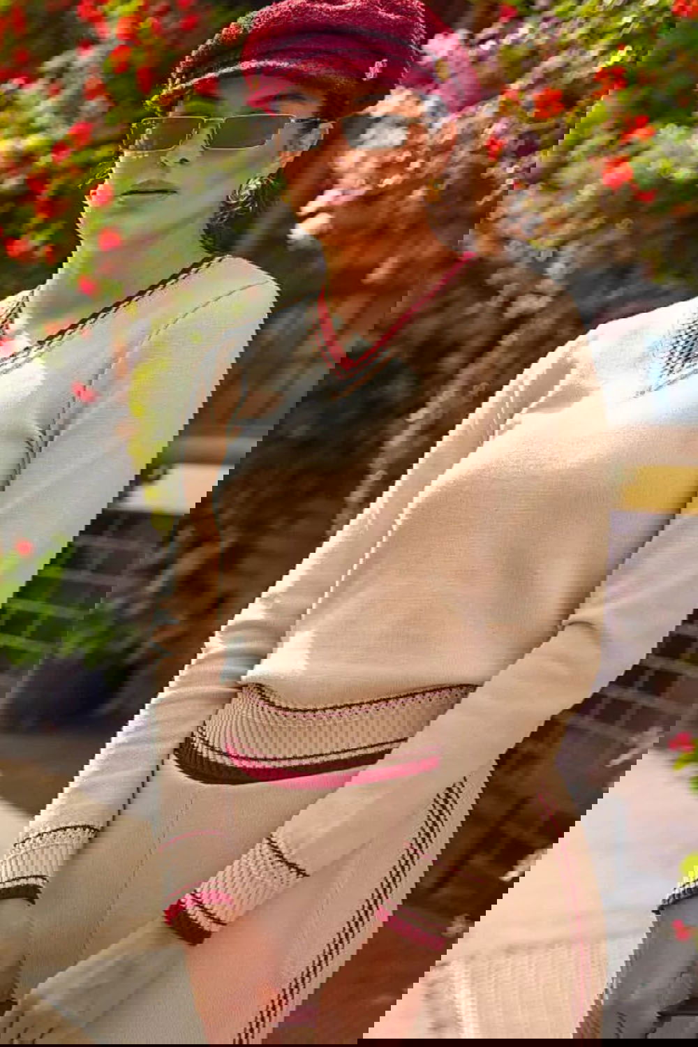 Suéter Oporto: De corte relajado y escote en V que estiliza. Se destaca por su exclusivo trabajo de terminaciones en contraste rojo vibrante en cuello, puños y bajo, aportando una riqueza visual y una presencia única a la prenda.