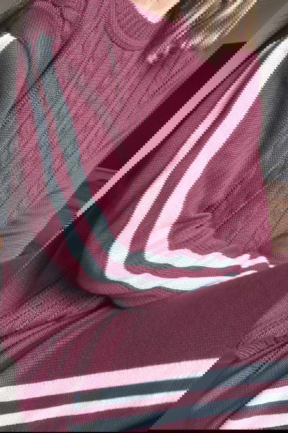 Suéter Urban: De corte relajado y cuello a la base que estiliza. Se destaca por su trabajo de trama de ocho trenzada en el torso y las icónicas franjas atléticas en contraste que recorren los brazos, aportando una riqueza visual y presencia a la prenda.