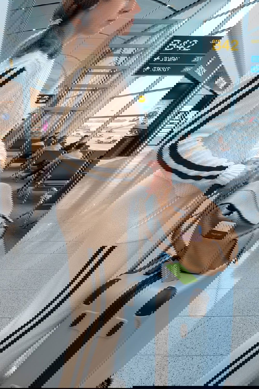 Versatilidad: Un set de estética Quiet Luxury con un guiño atlético-chic, ideal para un look effortless tanto para el aeropuerto (un travel outfit de ensueño) como para la ciudad.