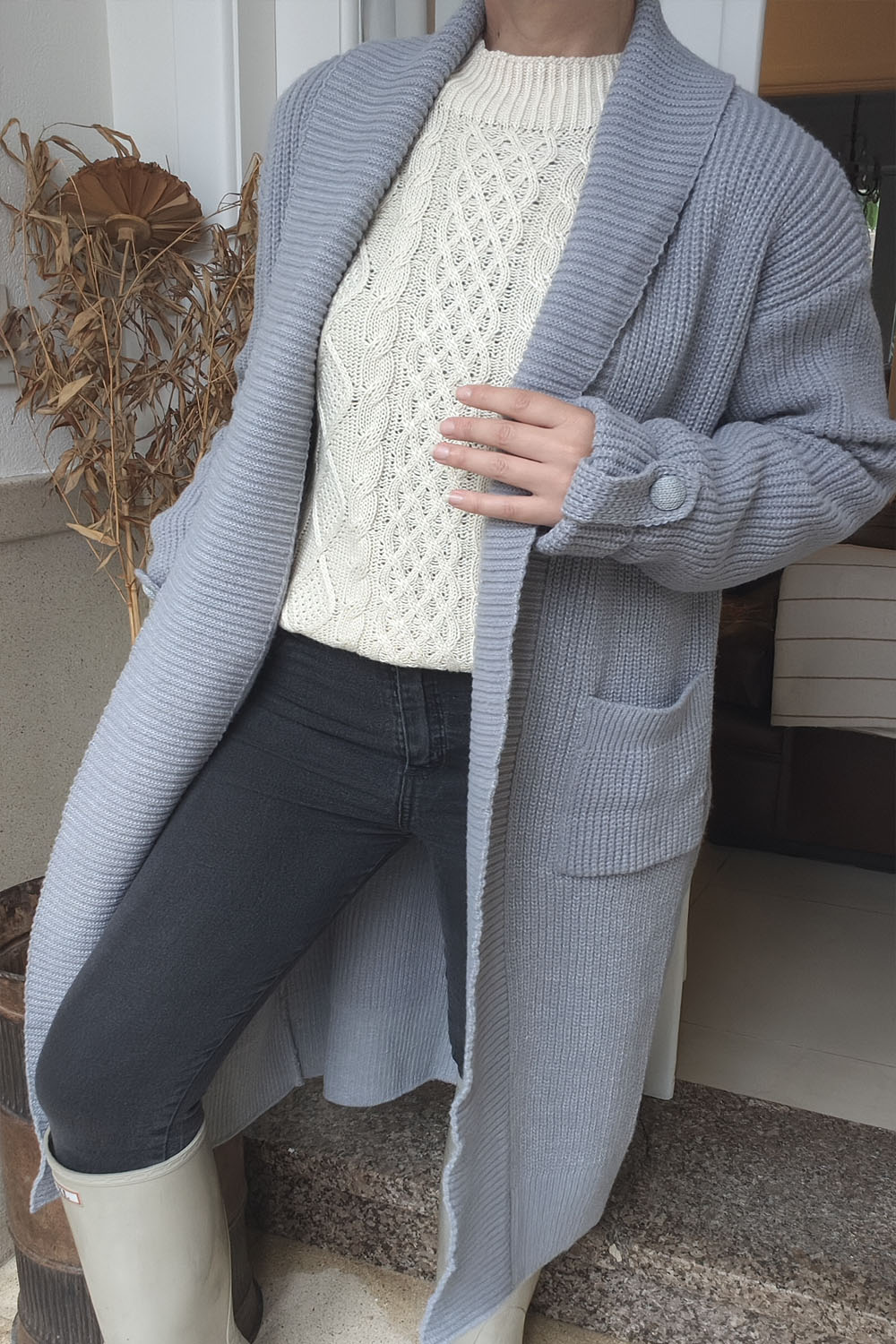 Versatilidad: Perfecto para elevar un look casual de jeans y sweater (como en la foto), o para usar sobre un vestido y botas altas. Su color gris azulado es un básico sofisticado que combina con todo.